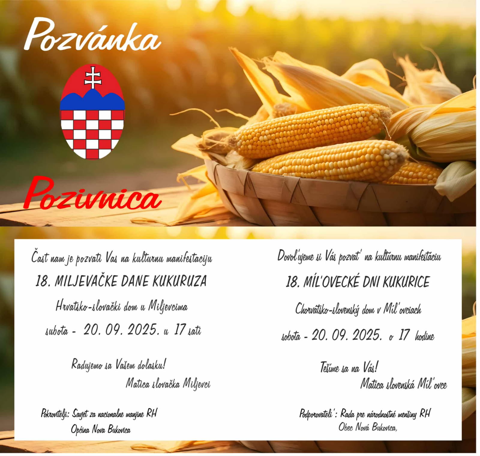 Matica Slovačka Miljevci za subotu 20. rujna, u Hrvatsko-slovačkom domu u Miljevcima, organizira 18. Milljevačke dane kukuruza.