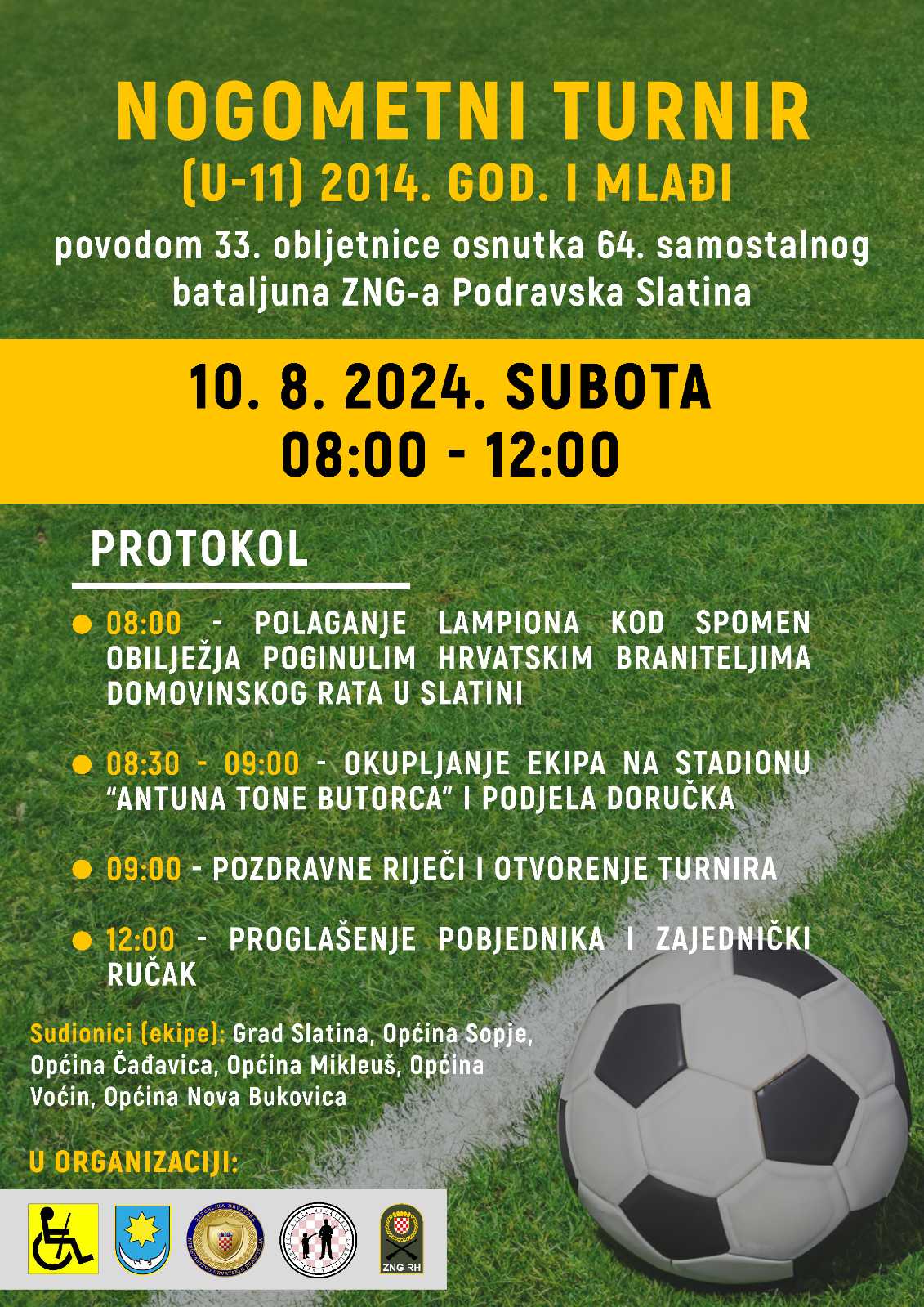 U subotu, 10. kolovoza 2024. godine u organizaciji Zajednice udruga i članova HVIDR-a Virovitičko-podravske županije uz suorganizaciju Udruge djece hrvatskih branitelja VPŽ održat će se 2. nogometni turnir povodom 33. obljetnice osnutka 64. samostalnog bataljuna ZNG-a Podravska Slatina.