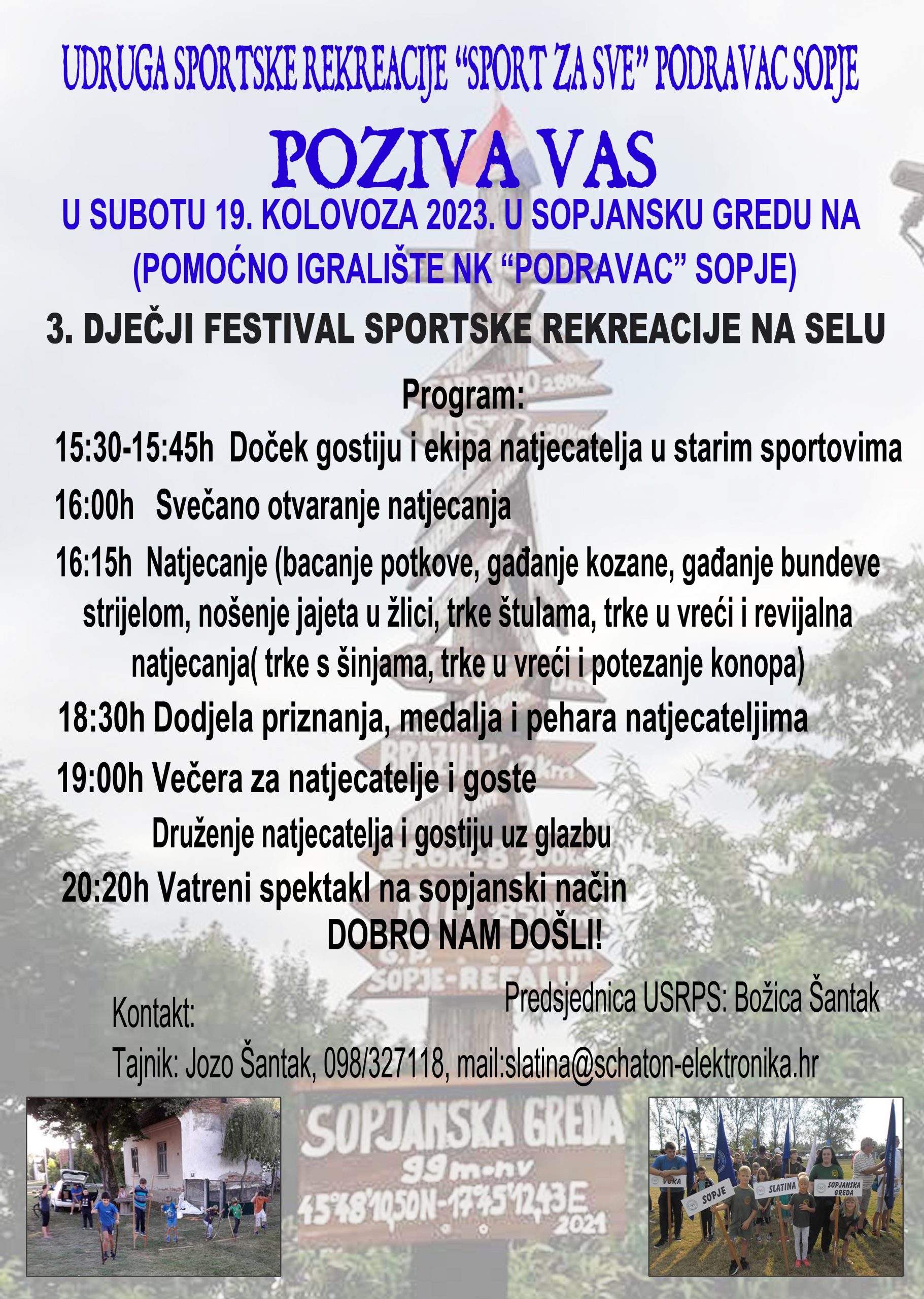 U organizaciji Udruge sportske rekreacije ”Sport za sve”, ”Podravac” Sopje ove će se godine održati 3. dječji festival sportske rekreacije na selu u Sopjanskoj Gredi.