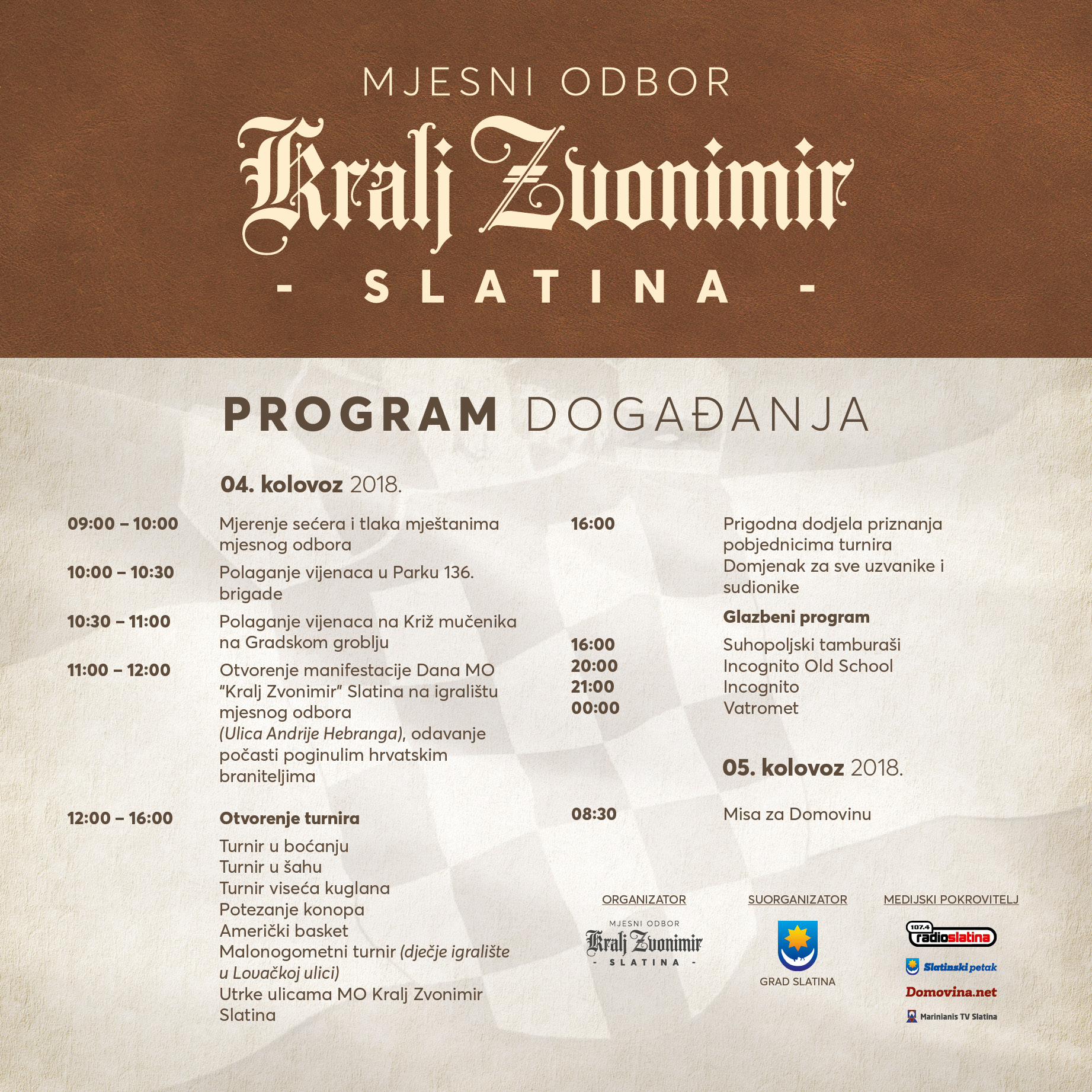 Vijeće Mjesnog odbora „Kralj Zvonimir“ Slatina na sjednici održanoj 5. lipnja ove godine donijelo je Odluku o Svečanom obilježavanju Dana MO „Kralj Zvonimir“ koji će se održati 4. kolovoza, a u suradnji s Gradom Slatinom uvrstit će se kao tradicionalna manifestacija u kalendar kulturnih događanja grada Slatine.