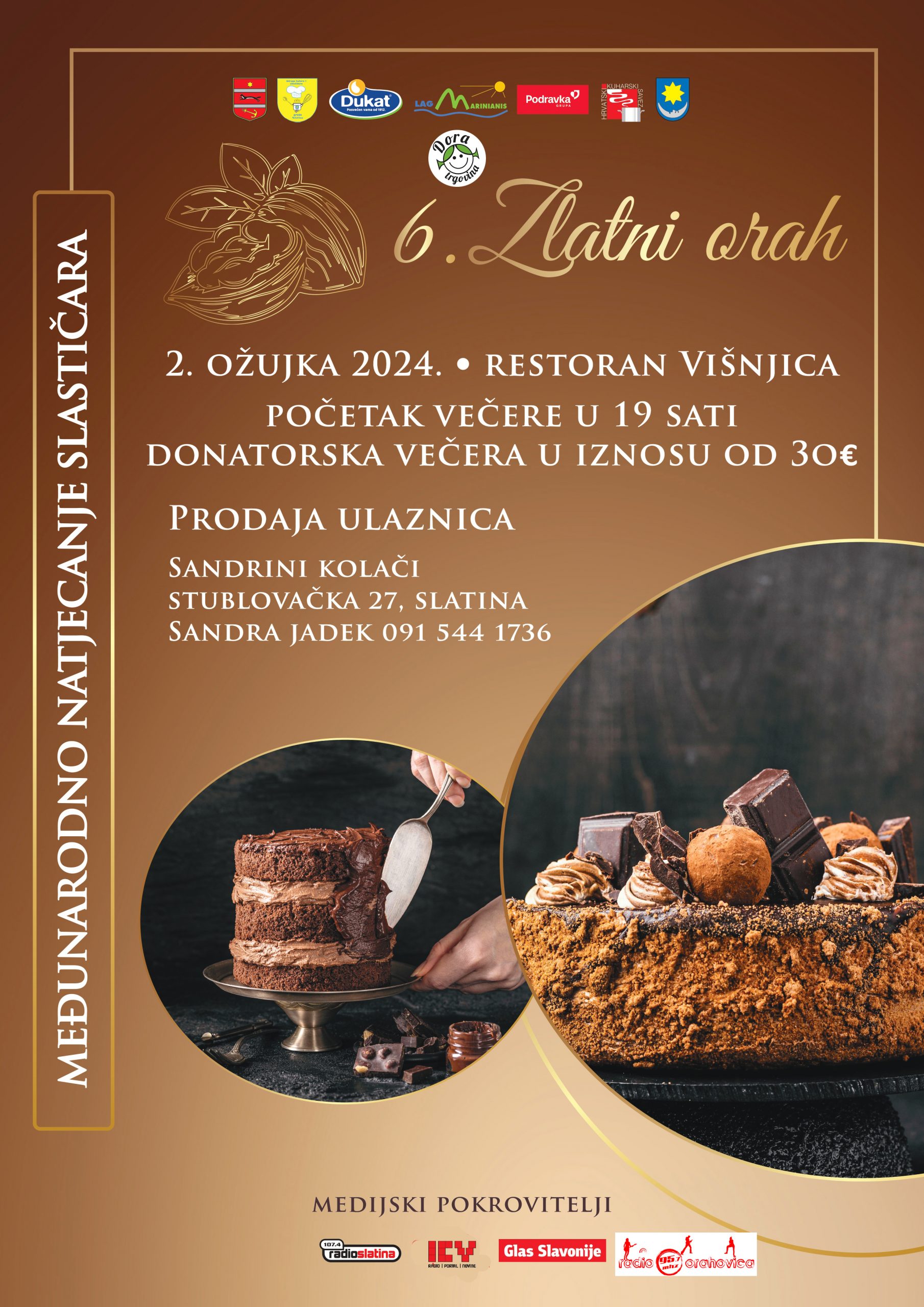 6. Međunarodno natjecanje slastičara „Zlatni Orah“ održat će se u organizaciji Udruge kuhara i slastičara grada Slatine i suorganizaciji Grada Slatine i LAG-a Marinianis Slatina, a pod generalnim pokroviteljstvom Virovitičko-podravske županije te stručnim pokroviteljstvom Hrvatskog kuharskog saveza, u subotu, 2. ožujka u Restoranu Pustara Višnjica nadomak Slatine.