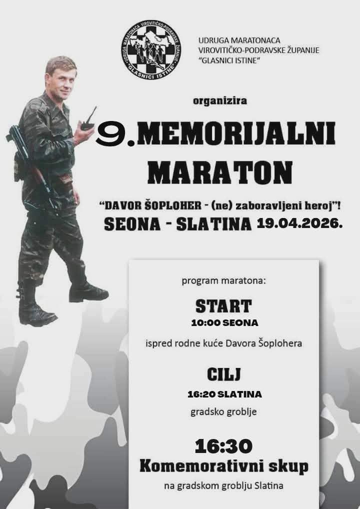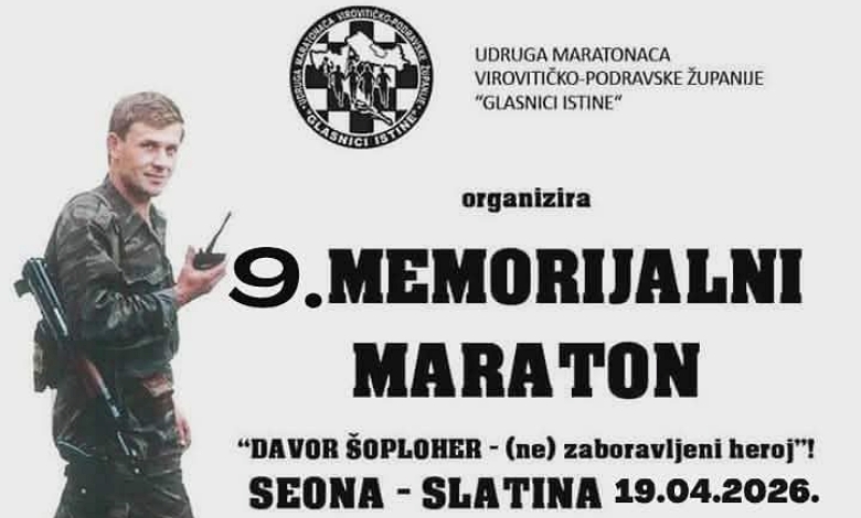 Udruga maratonaca Virovitičko-podravske županije „Glasnici istine“ u nedjelju, 19. travnja 2026. godine, organizira 9. memorijalni maraton u čast Davora Šoplohera, ratnog zapovjednika jedinice za posebne namjene pri Policijskoj postaji Slatina.