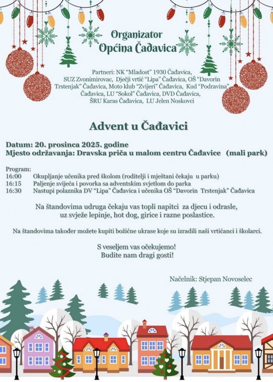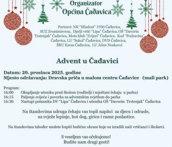 Općina Čađavica poziva sve mještane i posjetitelje na Advent u Čađavici, koji će se održati u petak, 20. prosinca 2025. godine, na lokaciji Dravska priča u malom centru Čađavice (mali park).