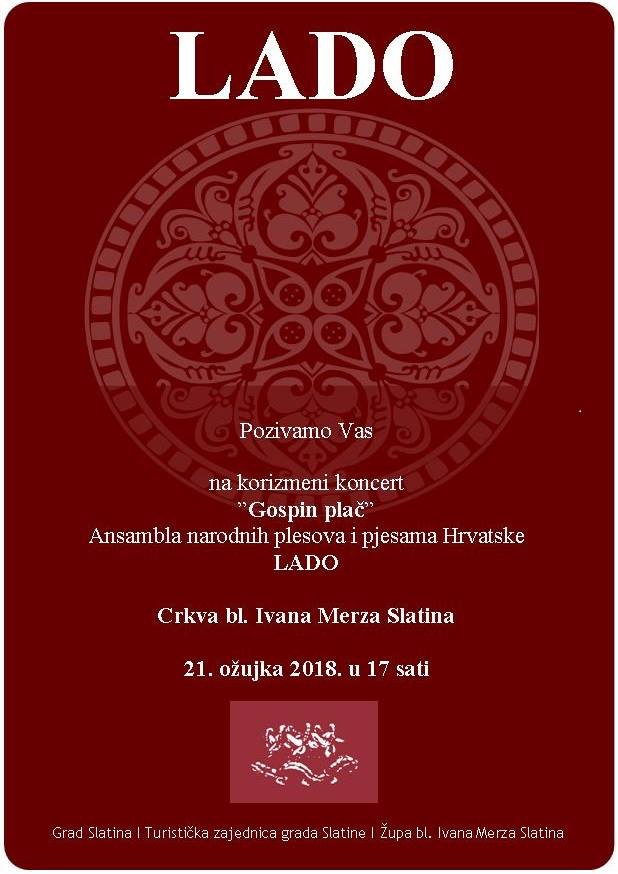 Ansabl narodnih pjesama i plesova Hrvatske LADO u srijedu 21. ožujka 2018. održat će korizmeni koncert “Gospin plač”