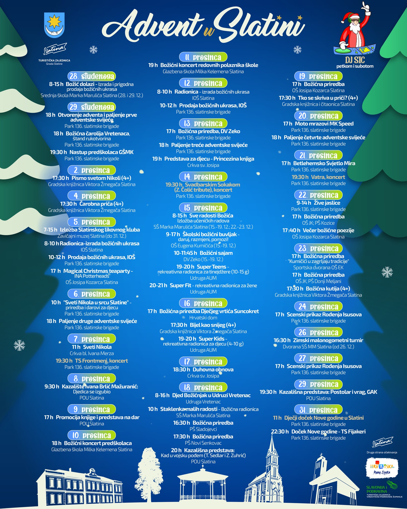 Advent u Slatini započinje 29. studenoga paljenjem prve adventske svijeće u parku 136. slatinske brigade, gdje se ove godine nalazi novi adventski vijenac. Nakon blagoslova vijenca i zajedničkog odlaska na misu u crkvu sv. Josipa, posjetitelje će razveseliti nastupi predškolaca i učenika Glazbene škole Milka Kelemena. „Dječica su nam u fokusu, oni su ti koji najviše donose veselje“, istaknula je.
