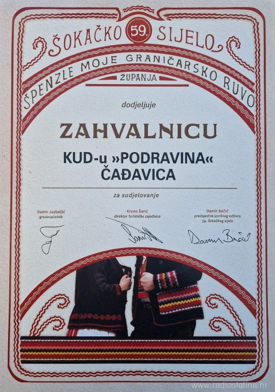 Dio raskoši i bogatstva Šokadije, narodnog ruha, kulturne baštine, narodnih običaja, tradicije i ponosa ovog vikenda bio je i KUD ”Podravina ” Čađavica koji je sudjelovao na folklornoj večeri 59. Šokačkog sijela u Županji.