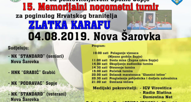 Nogometni klub Standard iz Nove Šarovke, pod pokroviteljstvom Općine Sopje, u nedjelju, 4. kolovoza, organizira 15. Memorijalni nogometni turnir u…