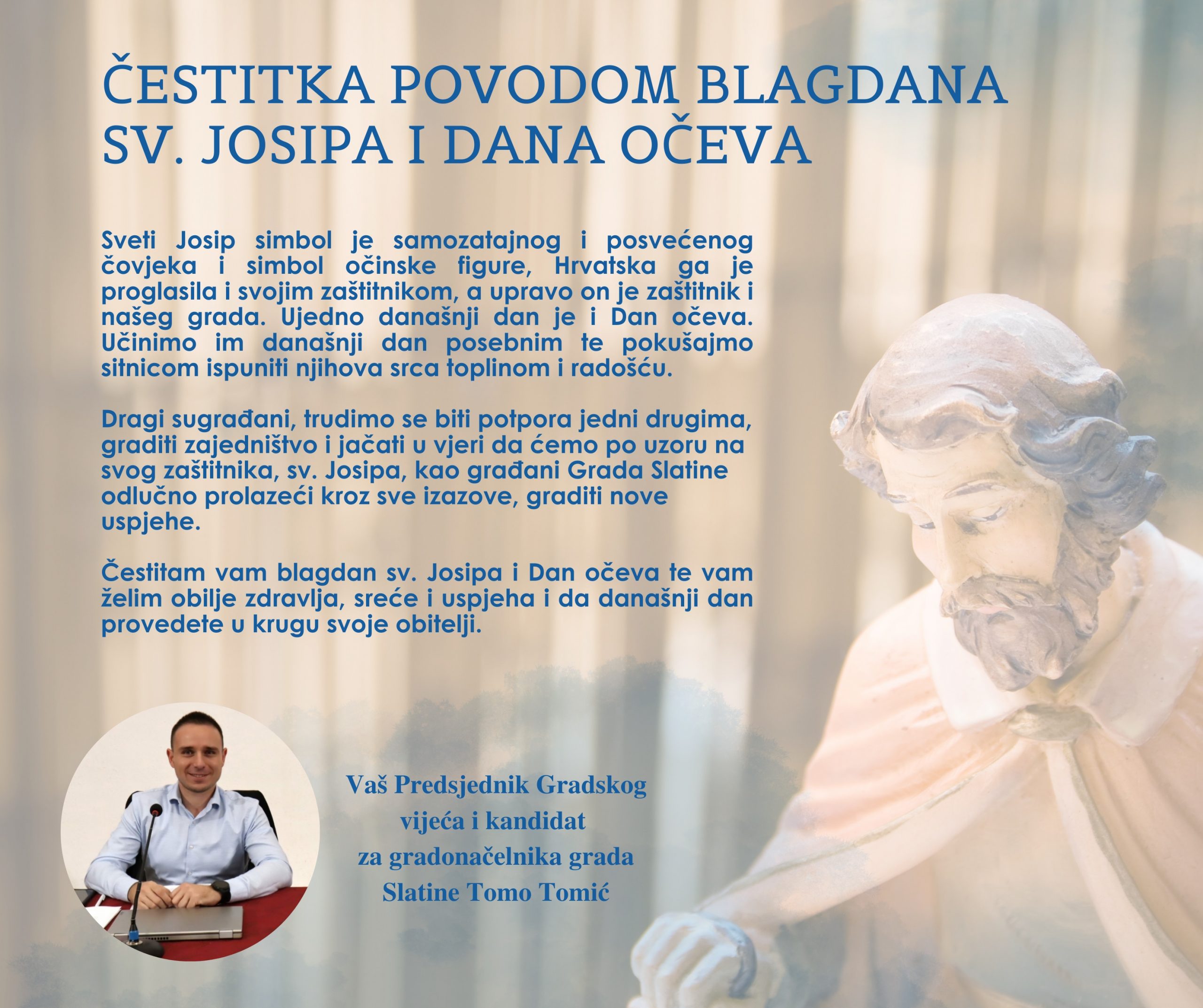 Početna/ČESTITKE/Čestitka predsjednika Gradskog vijeća i kandidata za gradonačelnika grada Slatine Tome Tomića povodom blagdana Sv. Josipa i Dana očeva ČESTITKENASLOVNICA Čestitka predsjednika Gradskog vijeća i kandidata za gradonačelnika grada Slatine Tome Tomića povodom blagdana Sv. Josipa i Dana očeva 19. ožujka 2025. 180 Facebook Pinterest WhatsApp Viber Share via Email Print 19. ožujka 2025. 180 Facebook Pinterest WhatsApp Viber Share via Email Print Facebook X LinkedIn Tumblr Pinterest Reddit Messenger Messenger WhatsApp Viber Share via Email Print