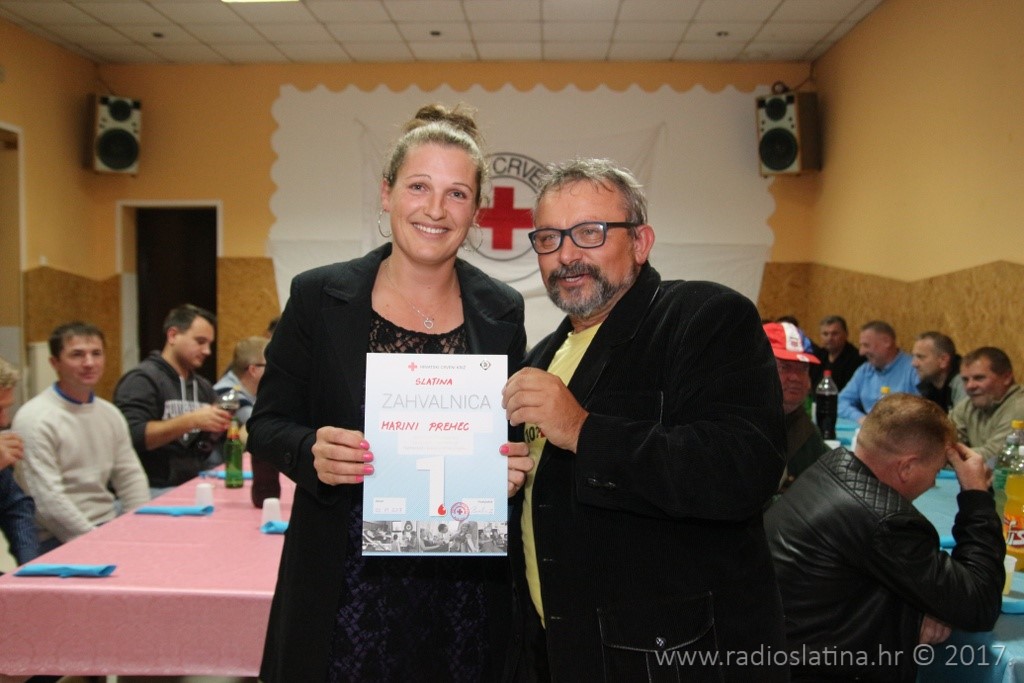 Svoje je više nego zasluženo priznanje za višestruka darivanja krvi dobilo više od 60 darivatelja koji su se sinoć odazvali pozivu Gradskog društva Crvenog križa Slatina. S obzirom na velik broj višestrukih darivatelja krvi iz Slatine i bliže okolice, mi ćemo ovom prilikom izdvojiti samo rekordere. Priznanje za čak 75 davanja krvi dobili su Zlatko Horvat, Damir Boljevčan i Stevo Vlahović iz Slatine te Ivan Cesar iz Nove Bukovice. Na brojci od 50 davanja zasad su Stjepan Srednoselac, Zlatko Jagodić, Danijel Kruljac, Marin Vilček i Dragan Kovačić iz Slatine, zatim Tomo Brezovčan, Tomislav Šantak i Tomislav Matić iz Sopja, Milan Jerman iz Miljevaca, Damir Leich iz Čađavačkog luga, Dalibor Benko iz Grabića, Vladimir Kovačec iz Josipova i Saša Beneš iz Gornjeg Miholjca.