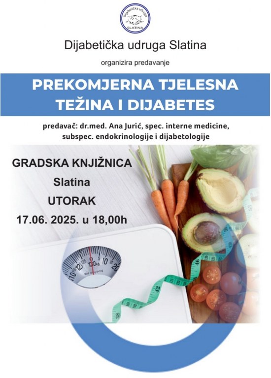 Dijabetička udruga Slatina poziva sve zainteresirane građane na stručno predavanje pod nazivom „Prekomjerna tjelesna težina i dijabetes”, koje će se održati u utorak, 17. lipnja 2025. godine s početkom u 18 sati, u prostoru Gradske knjižnice i čitaonice Slatina.