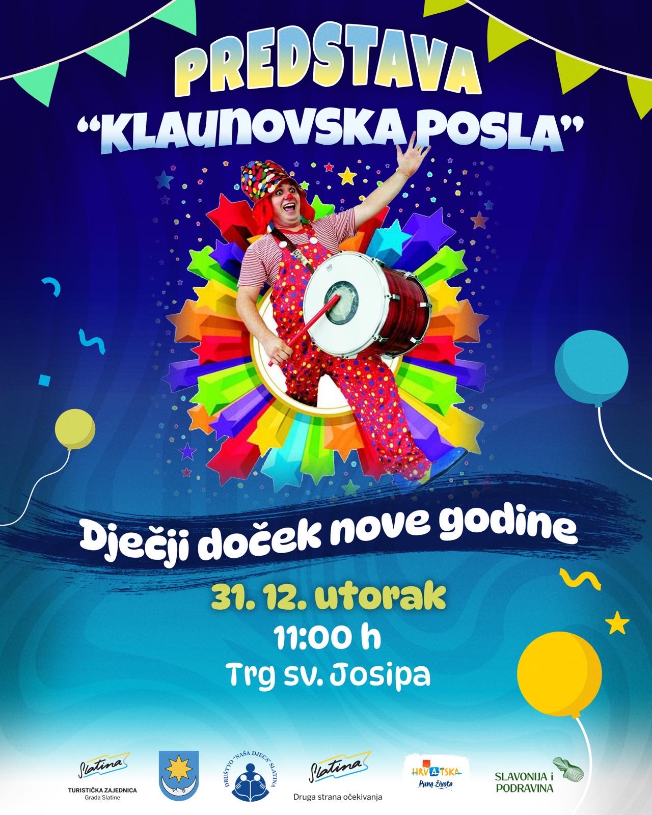 Uz predstavu “Klaunovska posla”, pjesme, ples i dječji šampanjac, djeca će u veseloj atmosferi odbrojavati posljednje sekunde Stare godine i dočekati Novu 2025. godinu.