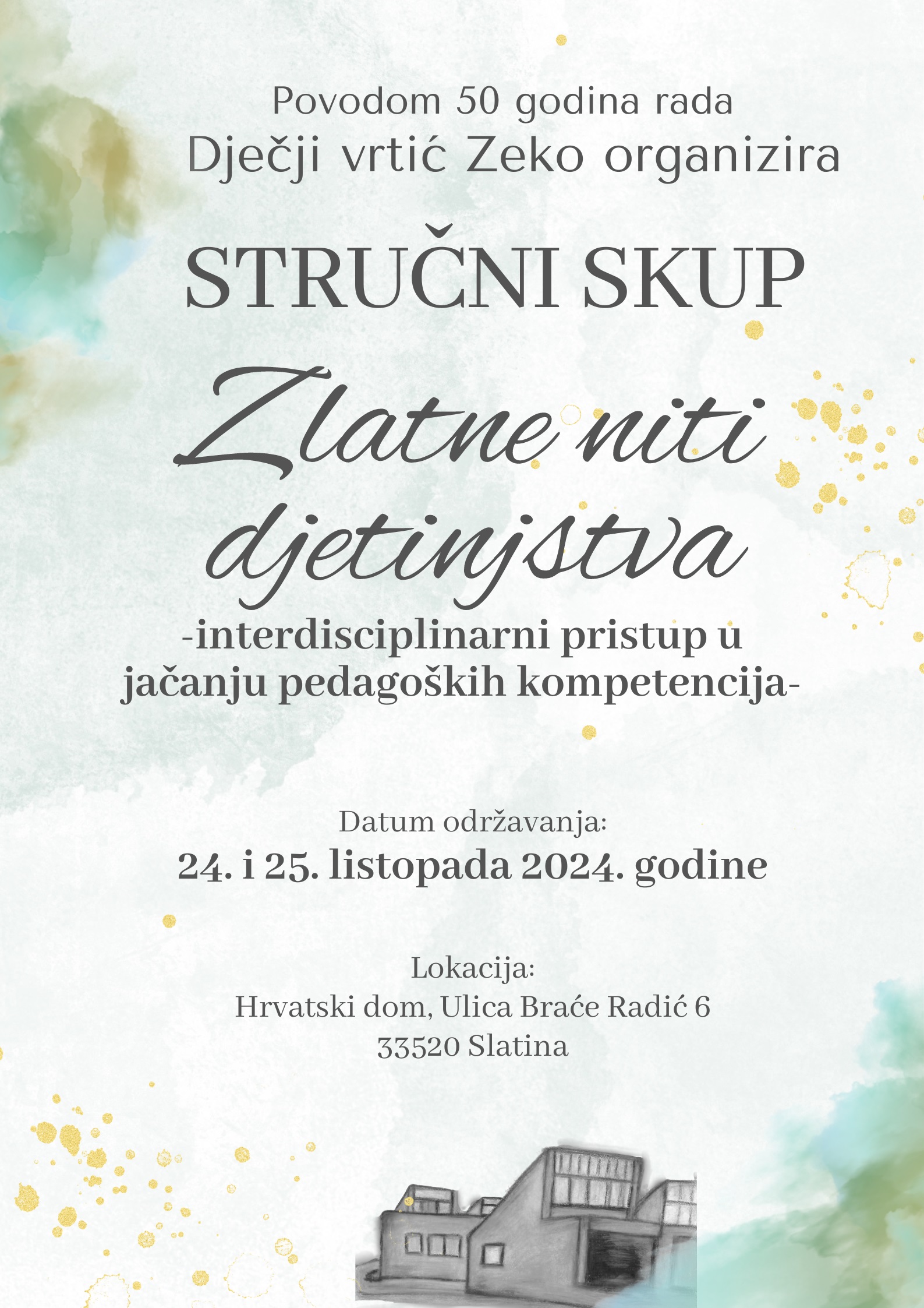 Dječji vrtić Zeko povodom 50 godina rada organizira stručni skup za odgojitelje, učitelje, stručne suradnike i ravnatelje koji sudjeluju u odgoju i obrazovanju djece rane i predškolske dobi. Skup naziva “Zlatne niti djetinjstva” organiziran je s ciljem promicanja važnosti dječjih prava, suradnje s roditeljima i inkluzije u predškolskom odgoju i obrazovanju. Stručni skup će se održati 24. i 25. listopada (četvrtak i petak) u Hrvatskom domu u Slatini od 12 do 18 sati.