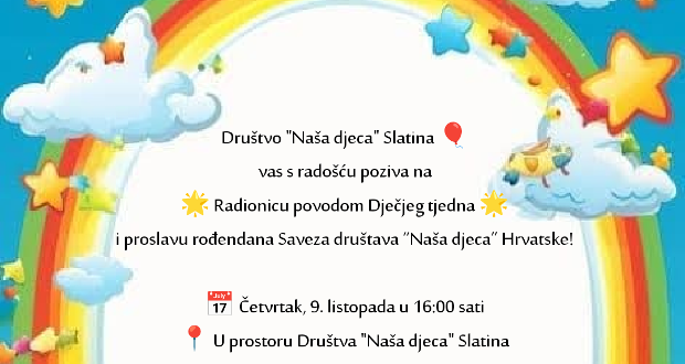 Društvo Naša djeca Slatina, pod pokroviteljstvom Grada Slatine, organizira radionicu povodom Dječjeg tjedna.