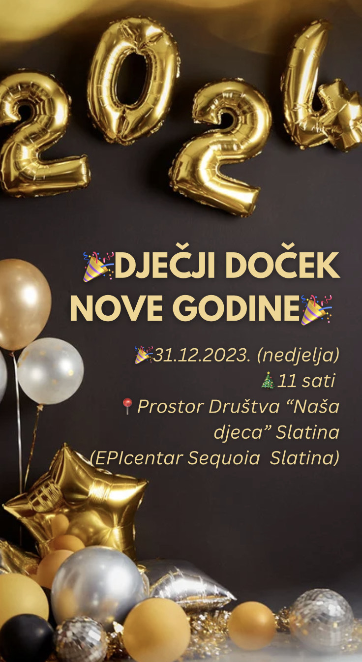 Ove će se nedjelje, 31.prosinca, s početkom u 11 sati u prostoru Društva “Naša djeca” Slatina (Epicentar Sequoia Slatina, zgrada 2) održati doček Nove godine namijenjen najmlađim Slatinčanima i Slatinčankama.