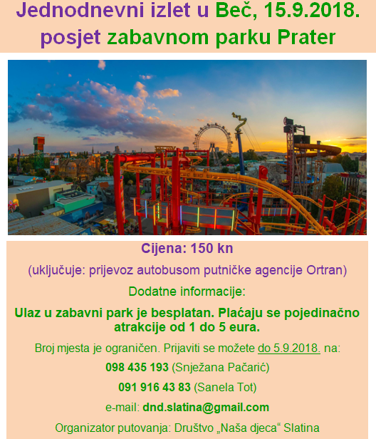 Isto tako DND Slatina poziva zainteresirane gađane na jednodnevni izlet u Beč, zabavnom parku Prater, 15. rujna s polaskom iz Slatine u ranim jutarnjim satima. Prijave se primaju do 5. rujna.