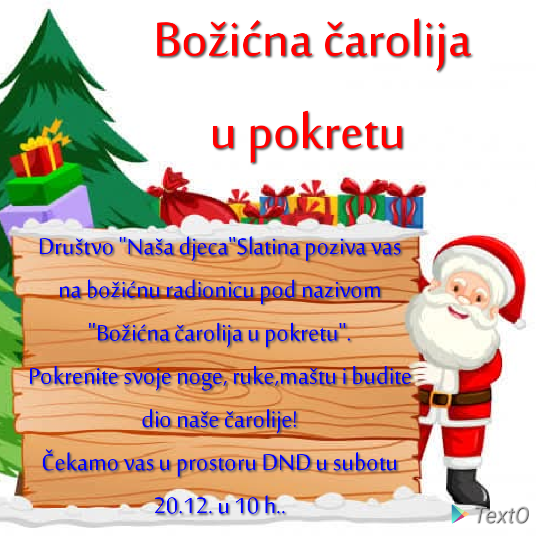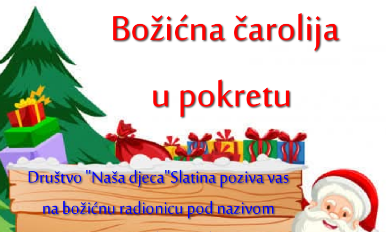 Društvo „Naša djeca“ Slatina organizira božićnu radionicu pod nazivom „Božićna čarolija u pokretu“, koja će se održati u subotu, 20. prosinca, s početkom u 10 sati, u prostoru DND-a Slatina.