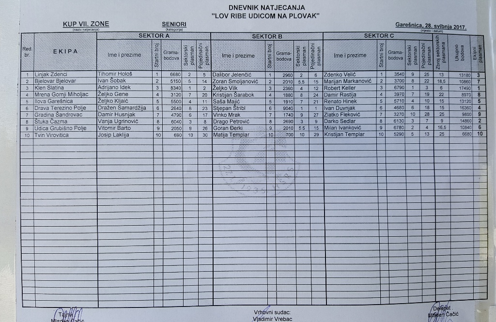 Uspješnim nastupom na Kupu županije Virovitičko-podravske na Bari u Budakovcu natjecateljska ekipa Športsko ribolovne udruge “Klen” Slatina plasirala se na međužupanijsko natjecanje VII. zone, a isto se održalo u nedjelju 28.05.2017. na jezeru Skresovi u Garešnici. Na Kupu VII. zone nastupila jedna juniorska ekipa udruge “Drava” Terezino Polje te ukupno 10 seniorskih ekipa, pet s područja Virovitičko-podravske županije i pet s područja Bjelovarsko-bilogorske županije.