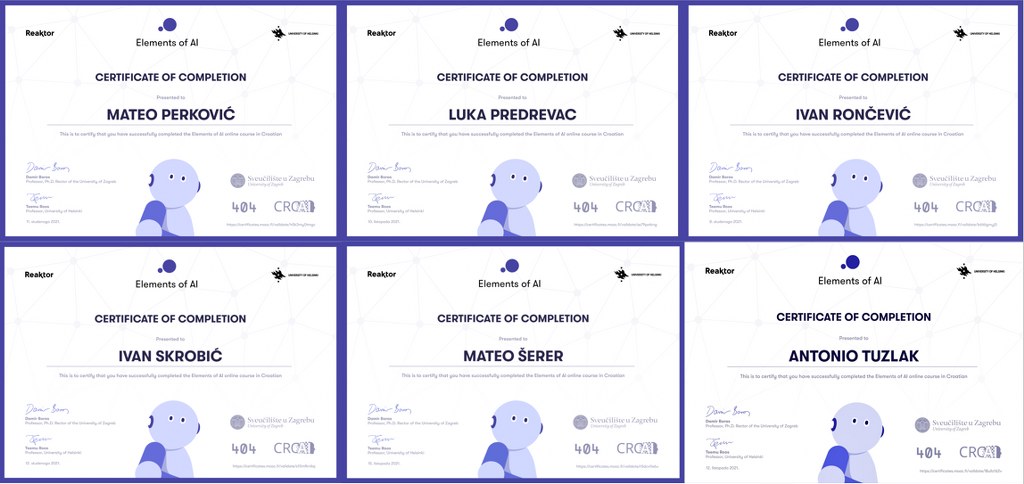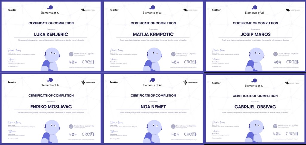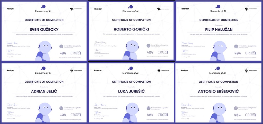 Besplatni je to online tečaj koji CroAI, Agencija 404 te Sveučilište u Zagrebu u suradnji s Reaktorom i Sveučilištem u Helsinkiju nude svim građanima Hrvatske za koji nije potrebno znati ništa o višoj matematici ili programiranju. Namjera tečaja je što više ljudi potaknuti da nauče što je umjetna inteligencija, što se sve pomoću nje može, a što ne te kako koristiti računalno razmišljanje. Cilj je uključiti što više učenika osnovnih i srednjih škola širom Hrvatske u veliki nacionalni izazov, a to je informirati 1% građana Hrvatske o umjetnoj inteligenciji. Umjetna inteligencija predlaže nam koju glazbu slušati na Spotifyu, koje filmove gledati na HBO ili Netflixu ili što pratiti na YouTubeu ili Facebooku. Ona više nije apstrakcija već je svakodnevno uključena u naše živote.