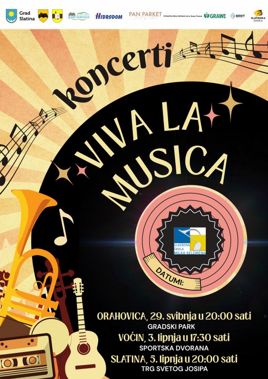 Prije slatinskog izdanja koncerta „Viva la musica“ učenici i učitelji Glazbene škole Milka Klemena Slatina nastupili su prošloga tjedna na istoimenom koncertu u Orahovici, a nastup imaju i danas, 3. lipnja u sportskoj dvorani u Voćinu s početkom u 17:30 sati.