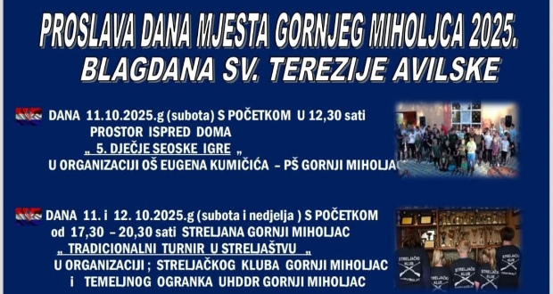 Povodom proslave Dana mjesta Gornji Miholjac i njegove zaštitnice sv. Terezije Avilske, u Gornjem Miholjcu se i ove godine tradicionalno priprema višednevni program koji je će se održati od 11. do 19. listopada, a u organizaciju su uključeni: Streljački klub „Miholjac“, Temeljni ogranak Udruge hrvatskih dragovoljaca Domovinskog rata Gornji Miholjac i Područna škola Gornji Miholjac pri OŠ Eugena Kumičića Slatina.