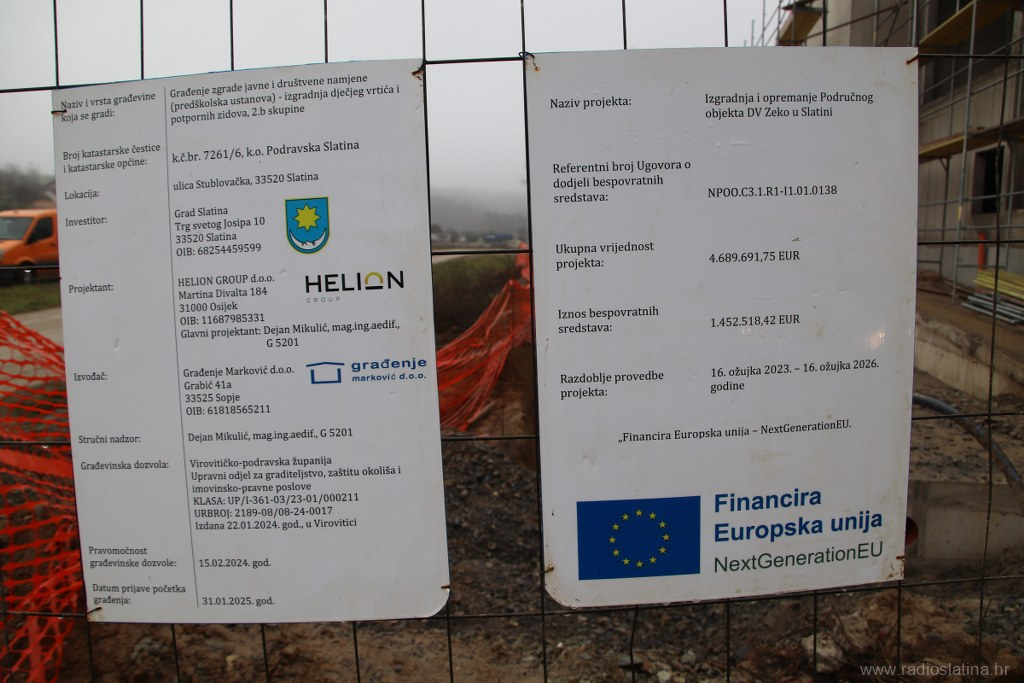 Podsjetimo, vrijednost radova je 4,69 milijuna eura, a projekt se provodi uz sufinanciranje EU sredstvima iz Nacionalnog plana oporavka i otpornosti, Programa izgradnje, dogradnje, rekonstrukcije i opremanja predškolskih ustanova – prvi poziv, s iznosom od 1,45 milijuna eura. Također, odobrena je financijska pomoć Ministarstva znanosti, obrazovanja i mladih za potpomognuta područja u iznosu od 1,5 milijuna eura, a Grad Slatina svoj udio osigurava iz kredita odobrenog od HBOR-a.