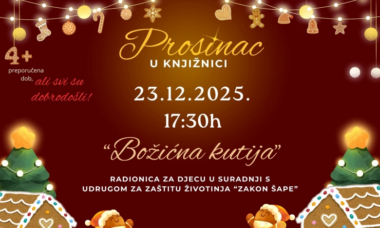 Gradska knjižnica Viktora Žmegača Slatina organizira blagdansko druženje za djecu pod nazivom „Božićna kutija“, koje će se održati u utorak, 23. prosinca 2025. godine, s početkom u 17,30 sati.