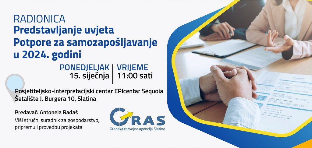 U ponedjeljak, 15. siječnja u Slatini će se održati predstavljanje uvjeta Potpore za samozapošljavanje u 2024. godini Hrvatskog zavoda za zapošljavanje.