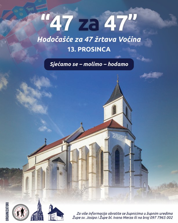 Župa svetog Josipa Slatina, Župa blaženog Ivana Merza Slatina i Udruga djece hrvatskih branitelja VPŽ organiziraju hodočašće pod nazivom “47za47”, posvećeno uspomeni na 47 nevino stradalih žrtava Voćina. U zajedništvu molitve, vjere i domoljublja želimo hoditi u dostojanstvu prema svima koji su izgubili život, prema njihovim obiteljima koje i danas nose teret boli, te prema istini koja se čuva samo ako je s ljubavlju i poštovanjem prenosimo dalje. Svaki hodočasnik nosit će jednu žrtvu u srcu, a naš će se zajednički hod pretvoriti u tihu molitvu predanja, uz riječi Svetog pisma koje nas prate: “Blago onima koji tuguju, oni će se utješiti”, “Gospodin je blizu skršenim srcima” i “Otrt će im svaku suzu s očiju”.