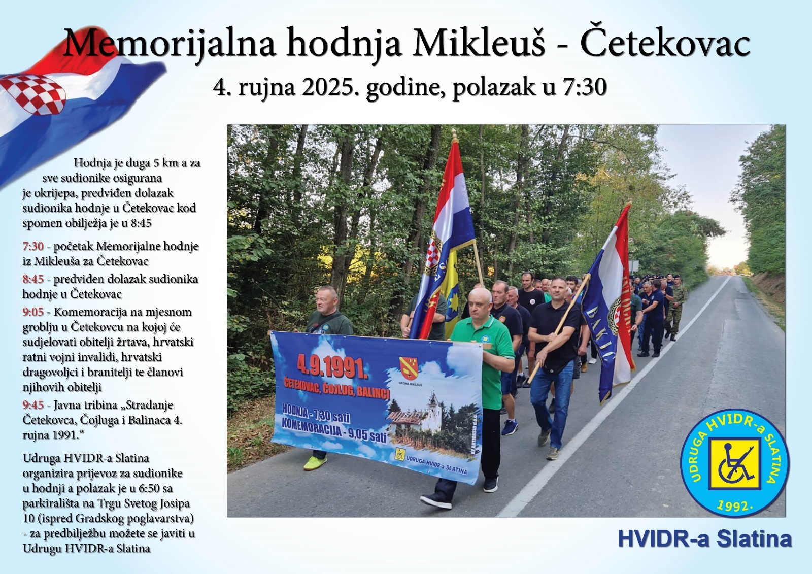 Udruga HVIDR-a Slatina i ove godine organizira Memorijalnu hodnju Mikleuš – Četekovac povodom obilježavanja tragičnih događaja iz 1991. godine. Događanje će se održati u četvrtak, 4. rujna 2025. godine.