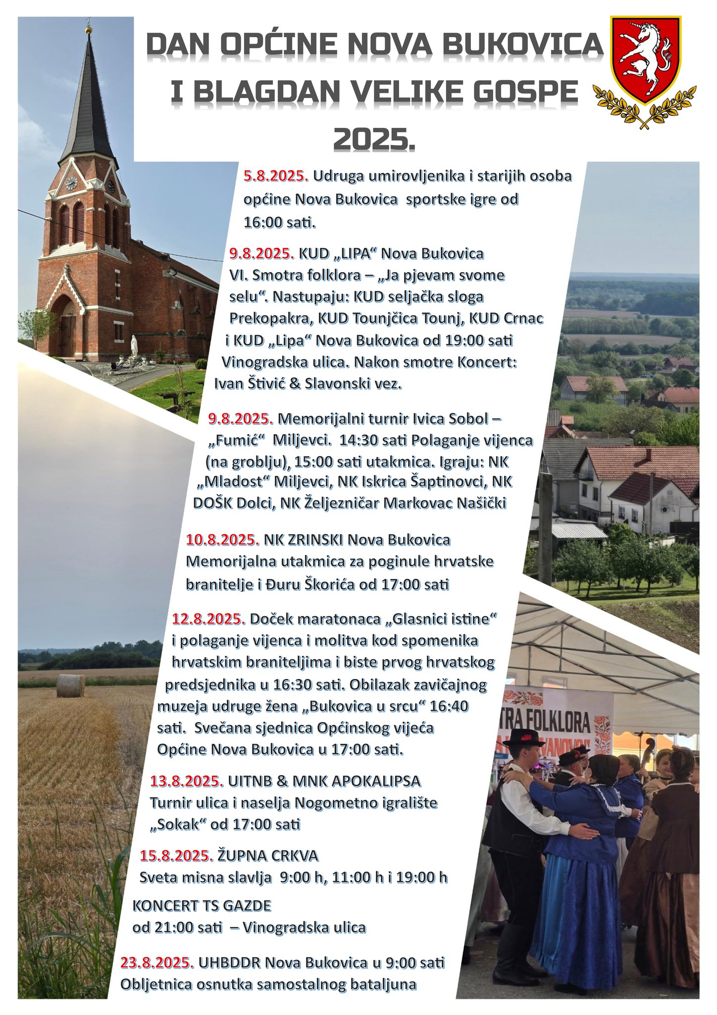 Povodom Dana općine Nova Bukovica i blagdana Velike Gospe, tijekom kolovoza organiziran je niz događanja kojima će se obilježiti lokalna tradicija, zajedništvo i uspomena na hrvatske branitelje.