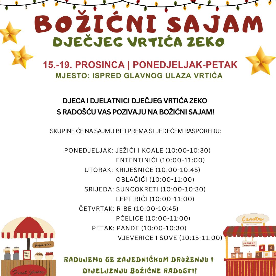 Božićni sajam ispred DV Zeko održavat će se svaki dan s početkom u 10:00 sati, a svakog će se dana predstavljati druge vrtićke skupine. Iz vrtića pozivaju sve građane da ih posjete, osjete duh Božića i pronađu neku posebnu sitnicu koja će uljepšati njihov dom ili bor, a ujedno podržati rad i razvoj najmlađih.