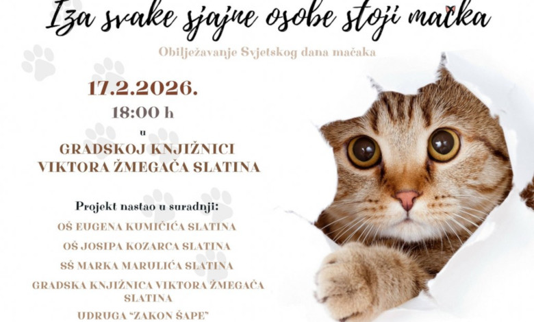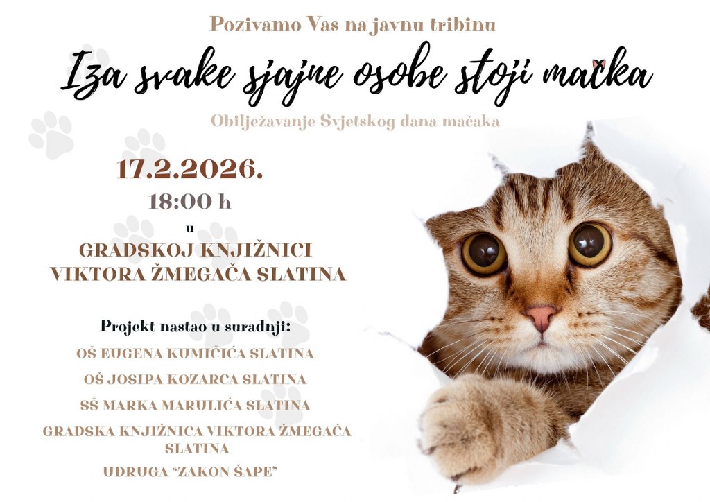 Povodom obilježavanja Svjetskog dana mačaka, u utorak 17. veljače 2026. godine u 18:00 sati, u Gradskoj knjižnici i čitaonici Viktora Žmegača Slatina održat će se javna tribina pod nazivom „Iza svake sjajne osobe stoji mačka”.