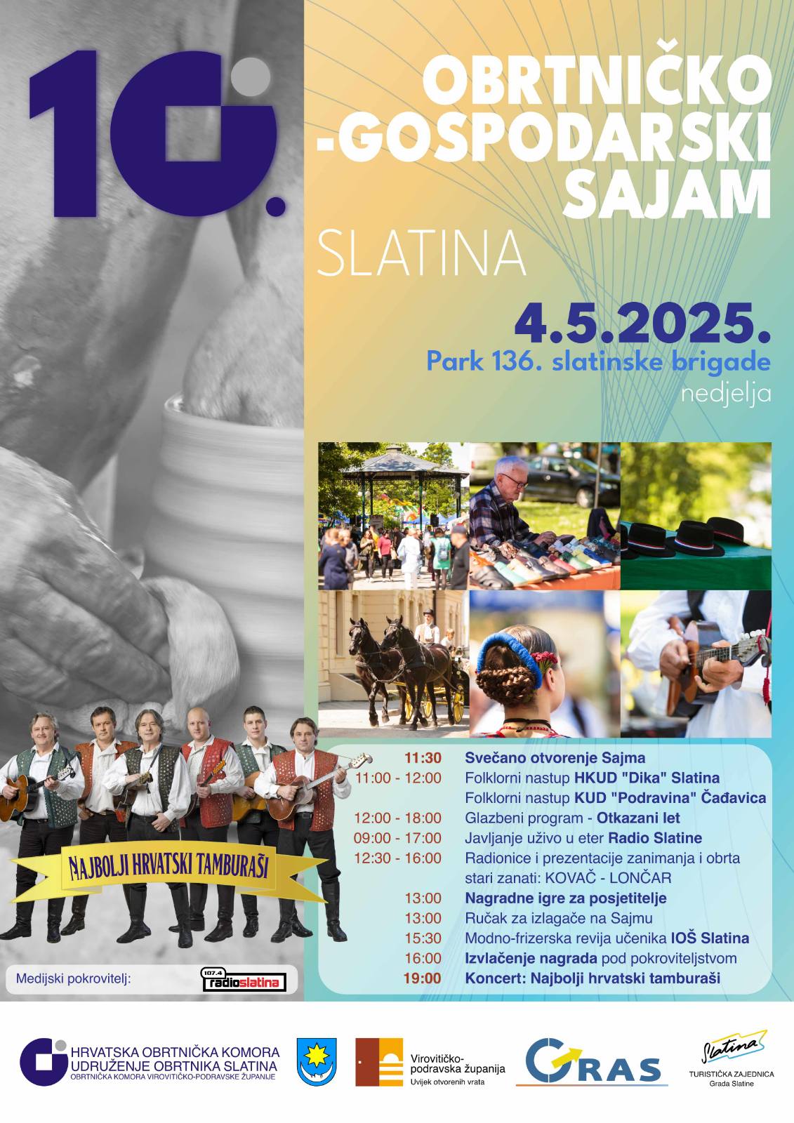 Udruženje obrtnika Slatina uz pokroviteljstvo Grad Slatine, Turističke zajednice grada Slatine, Gradske razvojne agencije Slatine, Virovitičko-podravske županije te HOK – Područne obrtničke komore Virovitičko-podravske županije poziva vas na jubilarni 10. Obrtničko-gospodarski sajam koji će se održati u nedjelju, 4. svibnja, u Parku 136. slatinske brigade.