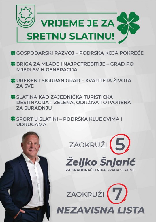 Kandidat za gradonačelnika Grada Slatine Željko Šnjarić predstavio je plan održivog razvoja grada Slatine i prigradskih naselja koji donosimo u cijelosti: