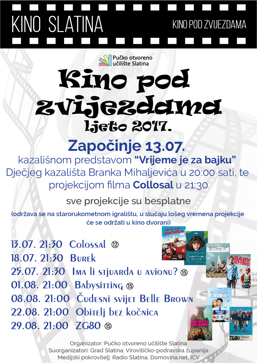 Ovog ljeta Pučko otvoreno učilište Slatina u sklopu „Kina pod zvijezdama“ pripremilo je sedam filmskih projekcija koje će se održavati utorkom na staroškolskom igralištu. Iznimka je jedino dan otvorenja kada su iz POU Slatina osim projekcije pripremili i kazališnu predstavu „Vrijeme je za bajku“ u izvedbi Dječjeg kazališta Branka Mihaljevića. Otvorenje će se održati u četvrtak 13. srpnja, s početkom u 20 sati kada će se održati predstava, a nakon koje je i filmska projekcija u 21:30.