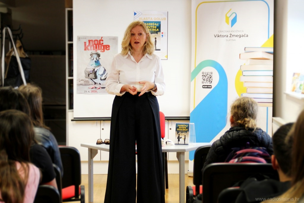 U povodu nacionalne manifestacije Noć knjige odnosno Dana hrvatske knjige i Svjetskog dana knjige i autorskih prava, u Gradskoj knjižnici Viktora Žmegača u Slatini održan je književni susret s Vlastom Golub, koja je tom prigodom predstavila svoj roman za djecu i mlade „Sadržaj žutog fascikla“.