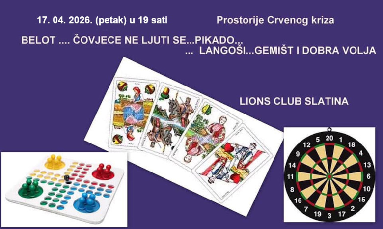 Lions club Slatina organizira u petak, 17. travnja 2026. godine, s početkom u 19 sati, večer društvenih igara i druženja koja će se održati u prostorijama Crvenog križa. Program je osmišljen kao neformalno okupljanje građana uz belot, pikado i igru „Čovječe ne ljuti se“, a za sve posjetitelje osigurani su langoši i osvježenja. Događaj ima primarno humanitarni karakter jer će se sva prikupljena sredstva usmjeriti za aktivnosti Lions kluba Slatina kojima se pruža pomoć sugrađanima u potrebi. Organizatori pozivaju Slatinčane i stanovnike okolice da se odazovu u što većem broju te da kroz zabavu i zajedništvo izravno doprinesu radu kluba i pomognu onima kojima je to najpotrebnije. Svi ljubitelji društvenih igara i ljudi dobre volje pozvani su da se pridruže ovoj akciji u petak od 19 sati i podrže plemeniti cilj slatinskih Lionsica.