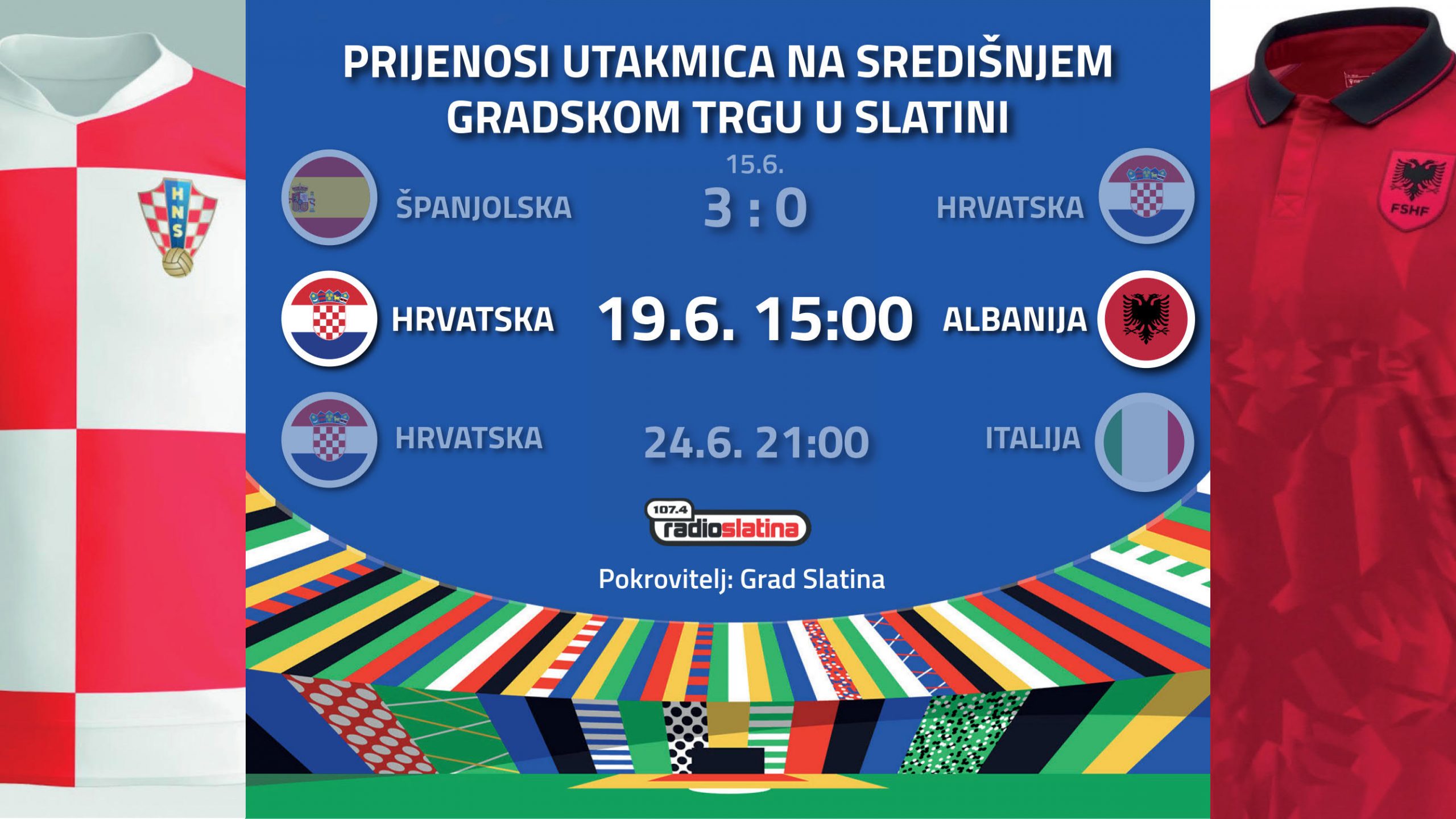 Live prijenos utakmice Hrvatska – Albanija u srijedu 19.6. od 15:00 sati na središnjem gradskom trgu