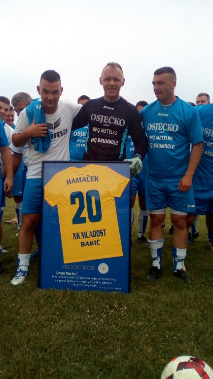 Zanimljiv prijateljski nogometni susret odigran je jučer u Bakiću. Povod istome bio je odlazak u zasluženu nogometnu ”mirovinu” vrsnog vratara, ali i dugogodišnjeg kapetan kluba iz Bakića Marka Hamačeka. U toj svojevrsnoj oproštajnoj utakmici sastali su se prva ekipa Mladosti protiv bivših igrača koji su proteklih godina zajedno s Markom branili boje bakićkog kluba. Ova nogometna revija poslužila je i kao svojevrstan uvod u doček velikog finala Svjetskog nogometnog prvenstva kojeg su i Bakićani čekali s velikim nestrpljenjem. Što se same utakmice tiče bila je to sasvim solidna predstava s ne baš previše elemenata prijateljskog susreta. ”Starci” su se prije početka susreta pojačali s nekoliko mlađih igrača (Gabrić, A.Horvat, I.Sraka) , ali i najboljim igračem bakićkog nogometa Milanom Prlićem.