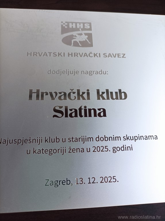 Hrvački klub Slatina proglašen je najuspješnijim klubom u starijim dobnim skupinama u kategoriji žena u 2025. godini, a plaketu je primio Borivoje Kocić.