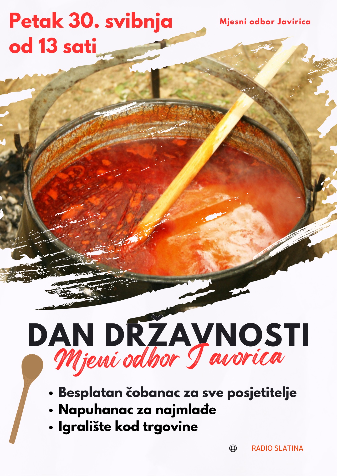 Mjesni odbor Javorica organizira proslavu Dana državnosti koja će se održati u petak, 30. svibnja u Ulici lipa u Slatini na igralištu kod trgovine s početkom u 13 sati.