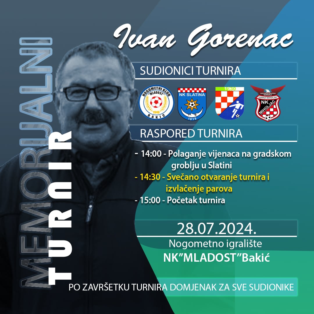 U organizaciji Nogometnog kluba Mladost Bakić u nedjelju, 28. srpnja održat će se 2. memorijalni nogometni turnir „Ivan Gorenac“.