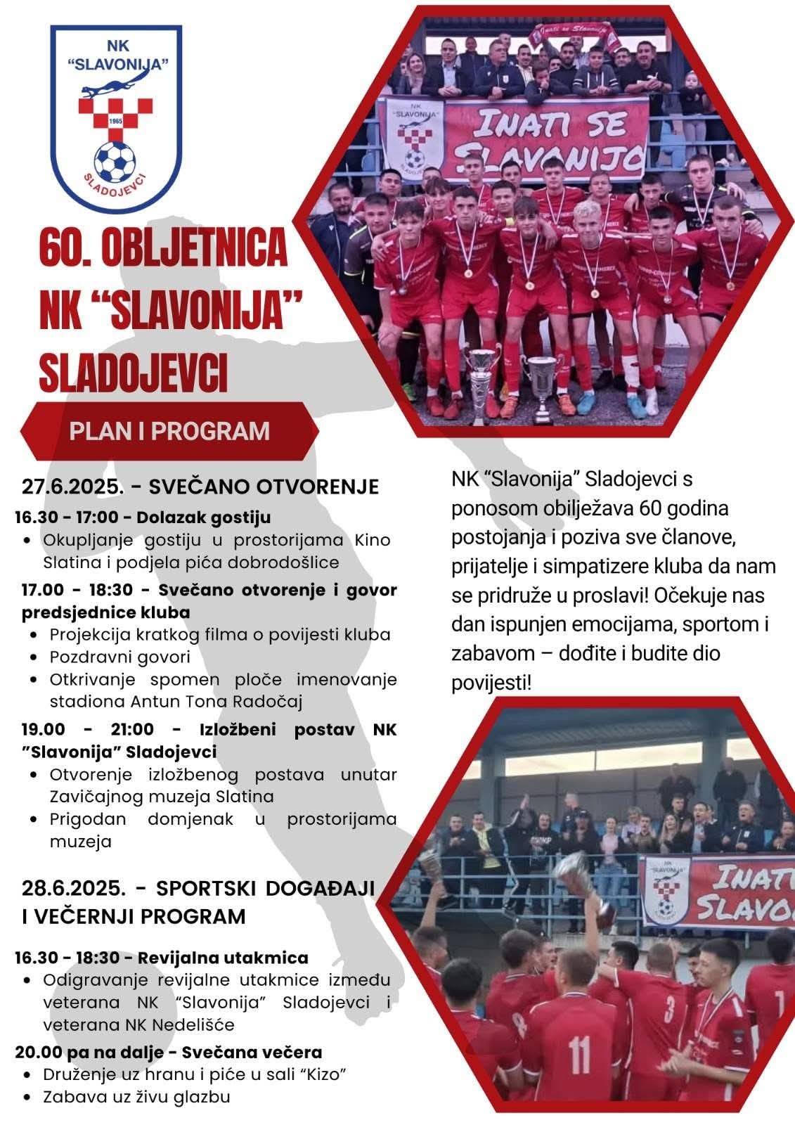 Nogometni klub “Slavonija” Sladojevci s ponosom obilježava 60. obljetnicu postojanja i tim povodom organizira dvodnevni program ispunjen emocijama, sportom i druženjem.