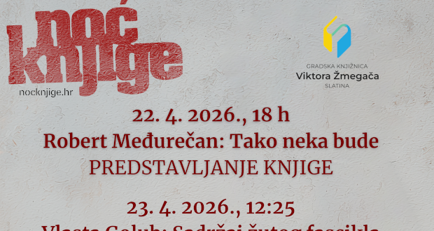 U okviru obilježavanja Noći knjige Gradska knjižnica Viktora Žmegača Slatina najavljuje gostovanje pisca Roberta Međurečana i predstavljanje njegova romana „Tako neka bude“ koji je u 2025. godini ovjenčan dvjema velikim nacionalnim književnim nagradama – Nagradom Ksaver Šandor Gjalski, a potom i Nagradom Janko Polić Kamov.