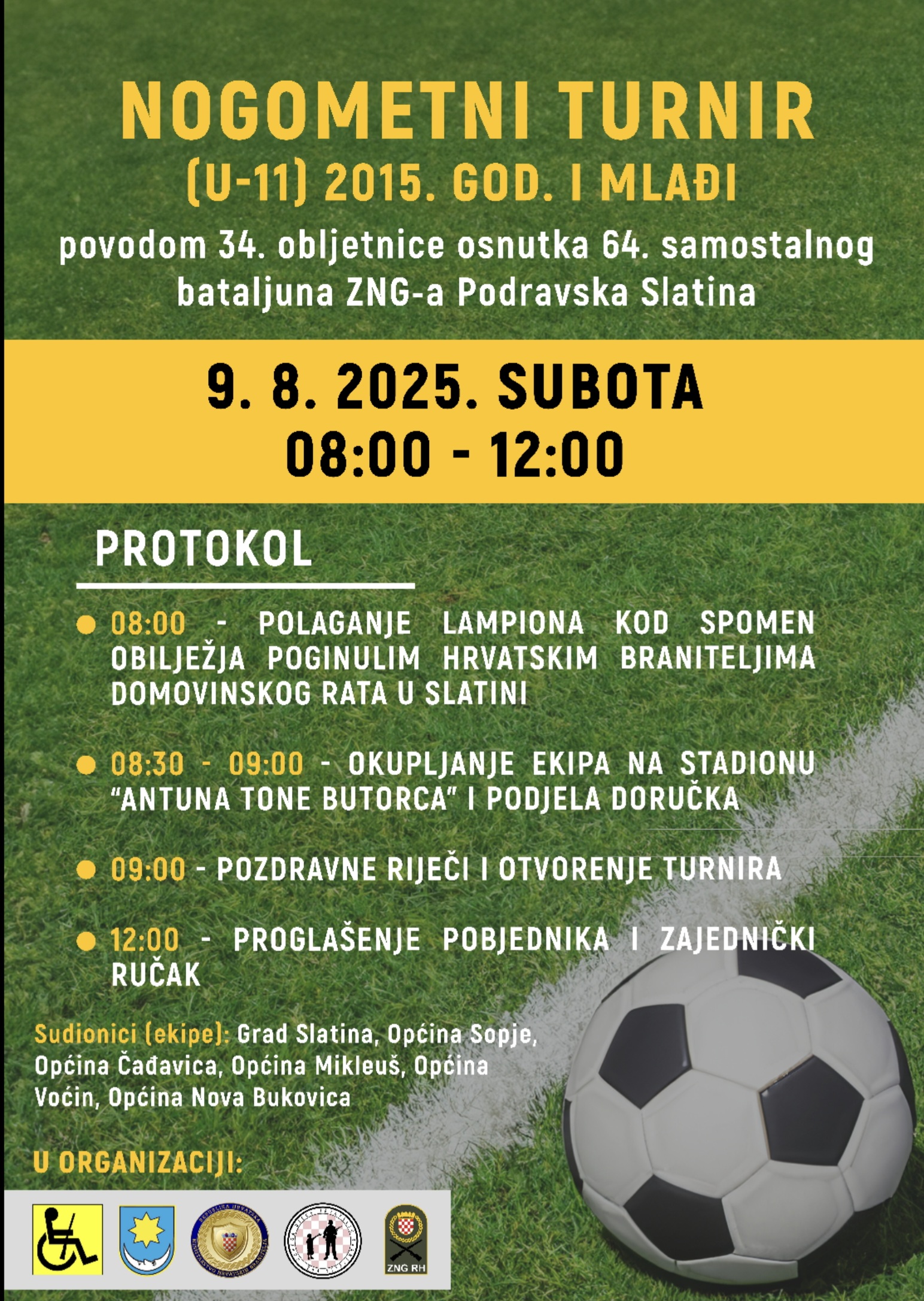 U povodu obilježavanja 34. obljetnice osnutka 64. samostalnog bataljuna Zbora narodne garde Podravska Slatina, Udruga djece hrvatskih branitelja Virovitičko-podravske županije i Zajednica udruga i članova HVIDR-a Virovitičko-podravske županije organiziraju prigodni nogometni turnir, koji će se održati u subotu, 9. kolovoza 2025. godine u Slatini.
