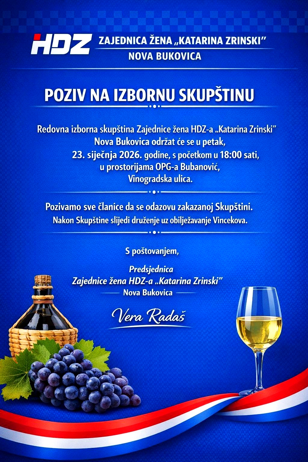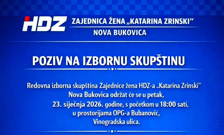 Redovna izborna skupština Zajednice žena HDZ-a „Katarina Zrinski“ Nova Bukovica održat će se u petak, 23. siječnja 2026. godine, s početkom u 18 sati.