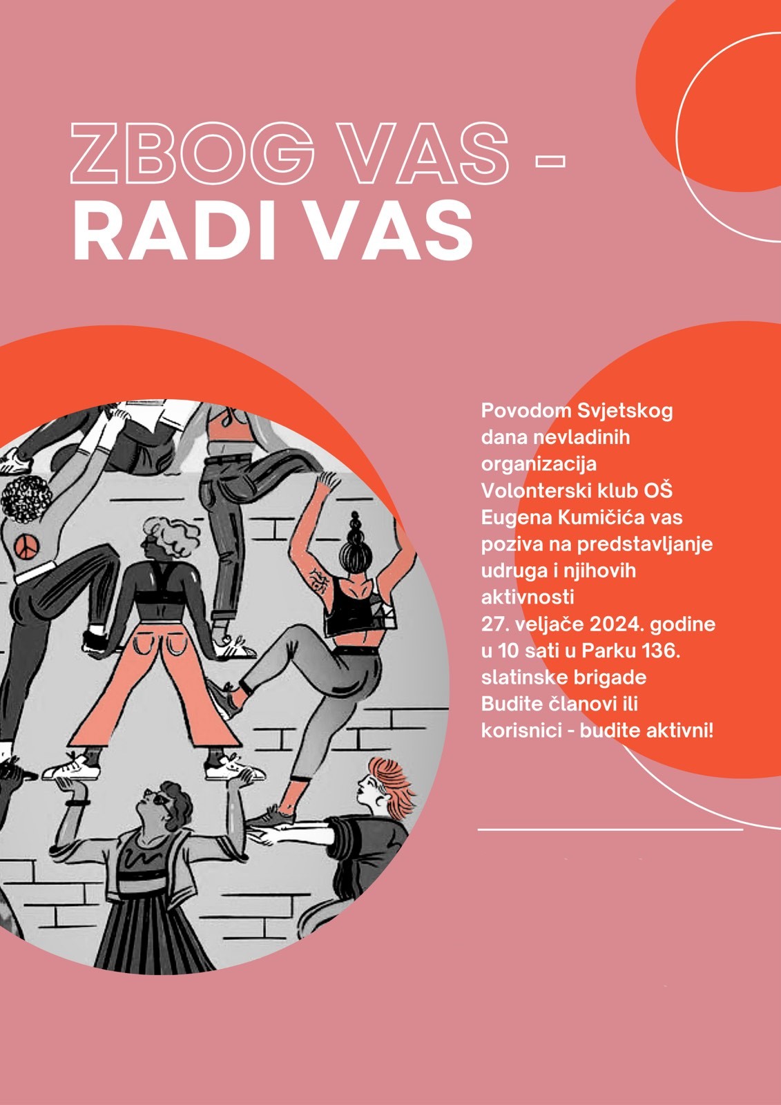 Naime, povodom Svjetskog dana nevladinih organizacija Volonterski klub Osnovne škole Eugena Kumičića u suradnji s Gradom Slatinom organizira akciju predstavljanja udruga (nevladinih organizacija) kako bi osvijestio građanstvo o potrebi njihova postojanja i djelokrugu njihova djelovanja te u najširem smislu riječi predstavio prilike koje nude. Predstavljanje će se održati u utorak, 27. veljače u Parku 136. slatinske brigade s početkom u 10 sati.