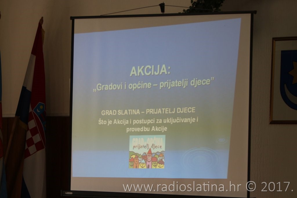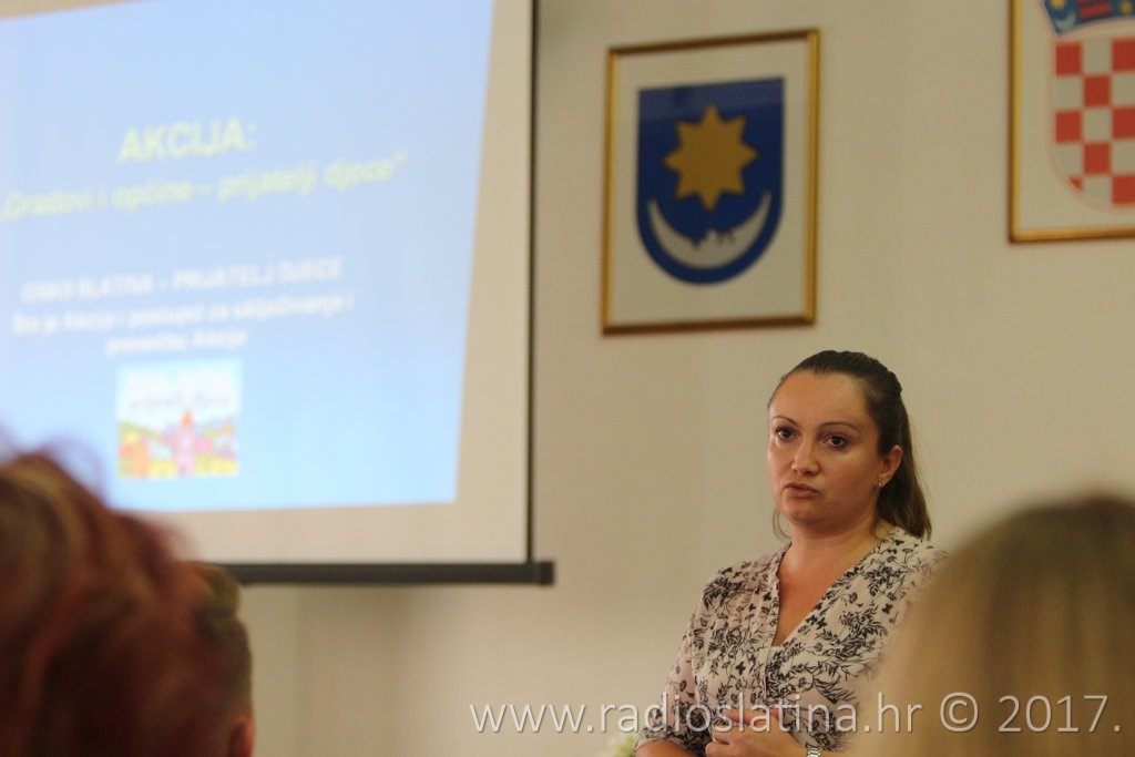 Predsjednica Društva „Naša djeca“ Slatina Snježana Pačarić u uvodnom dijelu sastanka prezentirala je okupljenima što to akcija „Gradovi i općine – prijatelji djece“ konkretno jest i koji su postupci za uključivanje i provedbu Akcije.