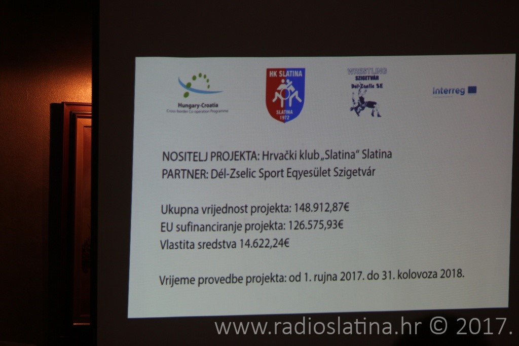Inače, EU ovaj projekt koji će se provoditi do 31. kolovoza iduće godine sufinancira sa 126.575,93 eura dok preostalih 14.622,24 eura pokriva Hrvački klub Slatina. Opći cilj ovog projekta je, kako ga je na početnoj konferenciji prezentirao Mario Petrak iz Hrvačkog kluba Slatine, organizacija međunarodnih natjecanja za djevojčice i dječake, te hrvačkih kampova, seminara i treninga , stvoriti zajednički proces koji bi osigurao kontinuitet učinkovite suradnje u graničnim regijama, a koji bi doprinio boljoj i učinkovitijoj suradnji dvaju prekograničnih hrvačkih klubova, Hrvačkog kluba Slatine i South – Zselic Sport Association iz mađarskog Szigetvara.