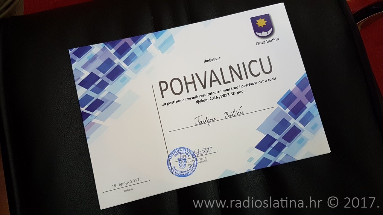 Danas vas želimo pohvaliti za vaš trud, požrtvovnost i znanje koje ste pokazali tijekom proteklih desetak mjeseci i što se sudjelovali na raznim državnim natjecanjima i smotrama i tako dokazali visoku razinu slatinskog obrazovanja u osnovnim i srednjim školama. Vaši mentori usadili su u vas ne samo znanje već i ostale životne vrijednosti pomoću kojih ćete se dalje kretati kroz život i biti na ponos svih građana našeg voljenog Grada.
